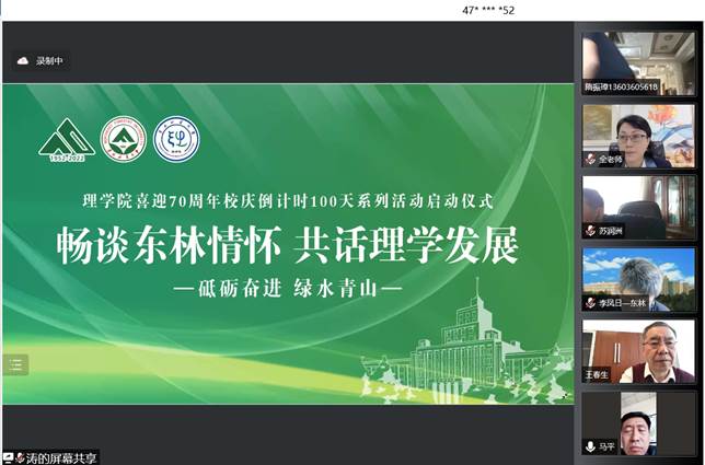 启动仪式结束后,20余位海内外校友与学院教师代表通过云端会话的形式,围绕“畅谈东林情怀 共话理学发展”进行了深入的交谈,校友们回忆在林大学习生活的难忘情景;感恩母校的培育;表达对授业恩师的思念、感恩之情,是恩师们严谨的治学态度为他们奠定了后续发展的基石,向恩师汇报取得的成绩;对母院的发展给出合理化建议;同时表示会在各自领域为学弟、学妹搭建发展平台,为母校、母院的建设发展出一份力,并对母校即将到来的70华诞送上最真挚的祝福!