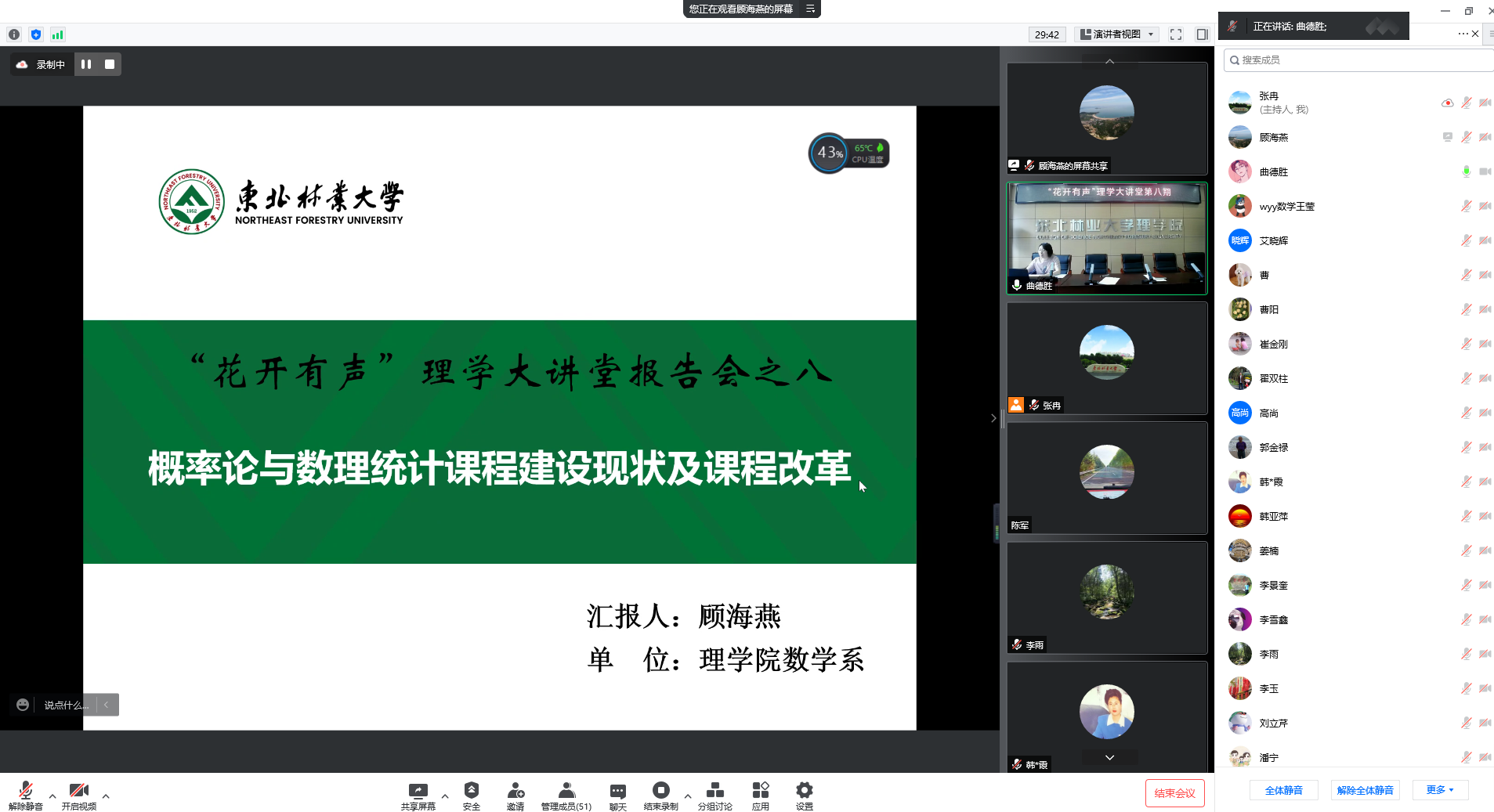 为深入学习贯彻习近平总书记重要讲话、重要指示精神,研究布署大学数学公共课体系化改革、师资队伍建设等阶段性中心工作,全面推进学院各项改革创新工作。6月1日下午,必一·运动(b-sports)以“线上线下”相结合的方式开展“花开有声”理学大讲堂第八讲,概率论与数理统计教研室主任顾海燕副教授分享课程育人经验,必一·运动(b-sports)党政领导班子成员及全体教职工参加讲座,院长助理王文龙副教授主持会议。