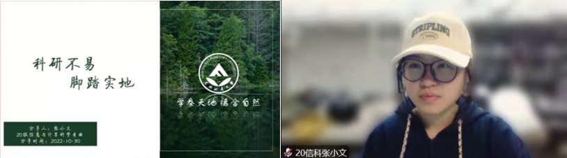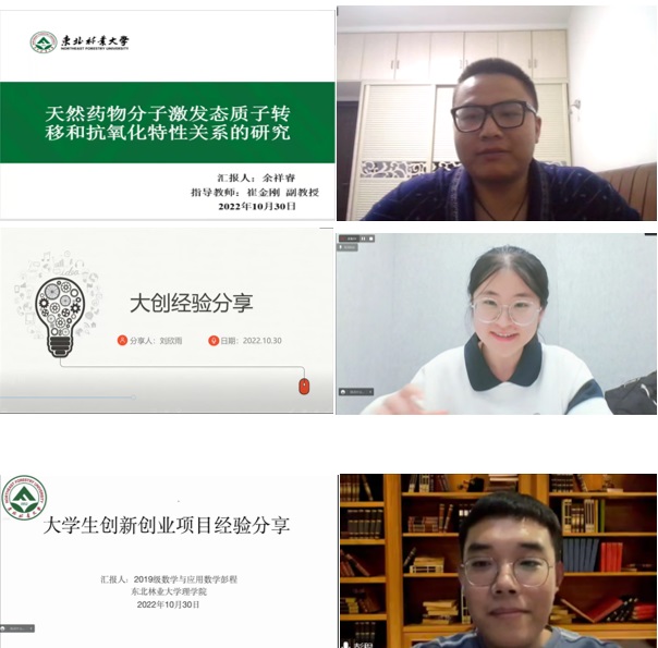 2020级信息与计算科学专业张小文,2019级物理学专业余祥睿,2019级数学与应用数学专业刘欣雨和彭程结合自身特点,针对大创项目的准备和研究等多个方面展开详细的介绍、经验分享和正确指引,分享各具特色、精彩纷呈。张小文分享科研是向外求索,对内省察的过程,无论是人文社科对解决社会问题的孜孜以求,还是自然科学对人类科技的积极探索,都要经历漫长的科研历程,足见科研与创新对人类进步的重要性。余祥睿分享自己进行大创项目研究过程中获得目标明确、自我驱动、打好基础、提高自学能力、挫折中成长等感受和经验,取得科研成果和辛勤付出是密不可分的。刘欣雨分享对大创需要有全面的了解并做好充足的准备工作,在项目实施过程中跟住指导老师、团队明确分工并合作完成目标,认真做研究才能出成果。彭程分享自己在大创项目研究过程中的收获,有价值观的塑造,团队合作能力的培养和学术能力的提升。参加大创项目,使得自身各方面的能力都得到了锻炼和提升。