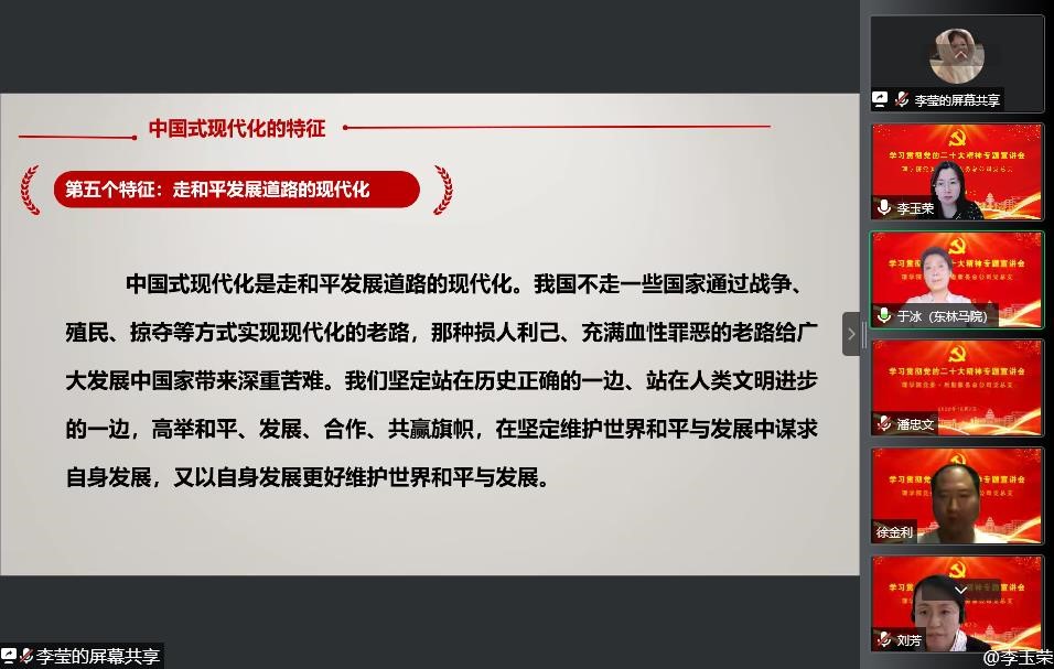 于冰教授从党的二十大的主题入手,紧紧围绕“牢牢把握过去5年工作和新时代10年伟大变革的重大意义”“牢牢把握新时代中国特色社会主义思想的世界观和方法论”“牢牢把握以中国式现代化推进中华民族伟大复兴的使命任务”“牢牢把握以伟大自我革命引领伟大社会革命的重要要求”“牢牢把握团结奋斗的时代要求”等五个“牢牢把握”的深刻内涵与重大意义进行了深入阐释。于冰教授结合自身学习体会,理论联系实际,旁征博引,情理并茂对党的二十大精神进行了生动的宣讲。