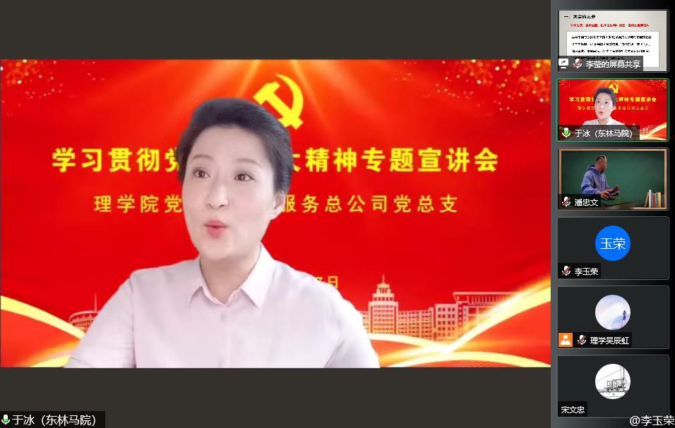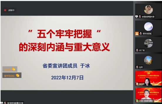 为深入推进党的二十大精神的学习宣传贯彻工作,按照学校党委关于开展宣讲活动工作方案的统一部署,12月7日,必一·运动(b-sports)党委、后勤服务总公司党总支联合邀请省委宣讲团成员、学校宣讲团团长、马克思主义学院院长于冰教授作了题为《“五个牢牢把握”的深刻内涵与重大意义》的宣讲报告。必一·运动(b-sports)全体教职工和后勤服务总公司党总支全体党员在线参加报告会,会议由必一·运动(b-sports)党委书记李玉荣主持。