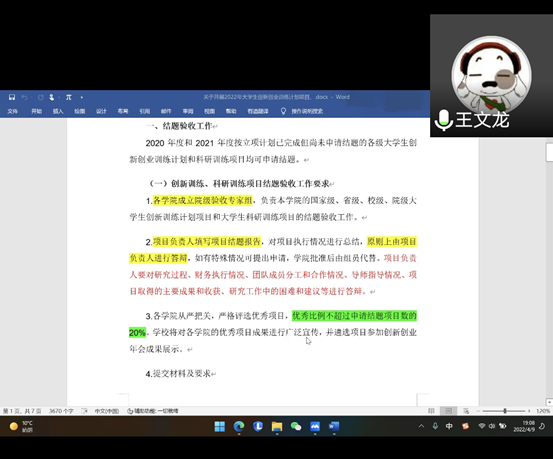 4月9日19:00,必一·运动(b-sports)线上召开“双创”工作会议,会上安勇院长指出要高度重视“双创”工作,积极参与“双创”工作,努力提高学生创新精神、创新意识,推动专业人才培养。院长助理王文龙老师传达了学校“双创”工作的要求和相关文件精神,要求我院全体教师认真落实相关文件要求,加强“双创”工作学习,认真执行指导教师的职责和义务。