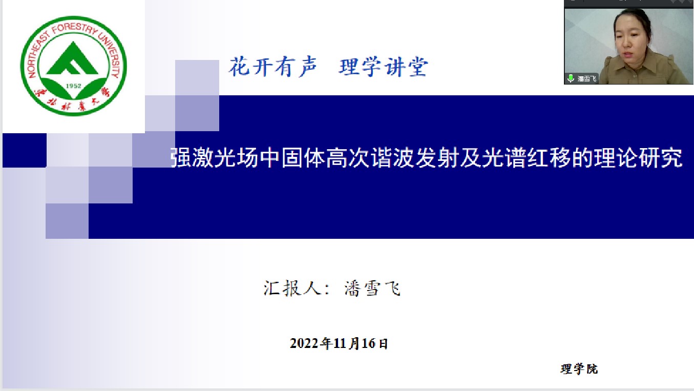 潘雪飞老师作了题为《强激光场中固体高次谐波发射及光谱红移的理论研究》的报告。她首先介绍了固体高次谐波发射的研究背景,以及近些年的部分研究进展。目前已针对目前掺杂半导体的能带劈裂和高次谐波发射的问题,以及不同电离通道下的固体高次谐波发射,对固体高次谐波发射中的电子复合过程和固体高次谐波发射的光谱红移进行了系统研究。相应研究成果公开发表在《J. Phys. B: At. Mol. Opt. Phys.》等学术期刊。