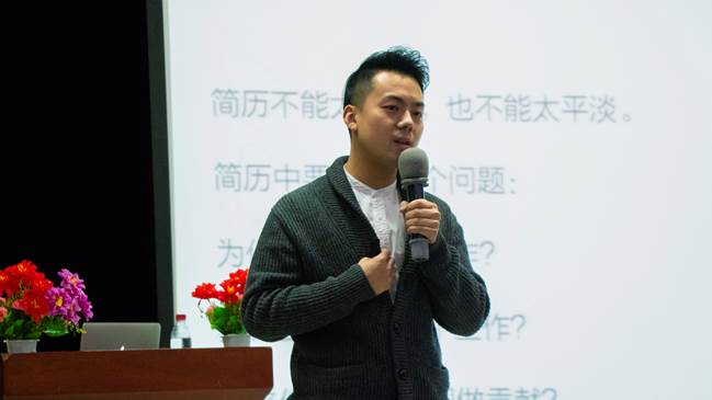 本次就业指导课程讲解内容分为简历制作和面试介绍两个部分。首先, 严尚哲老师通过与同学们的互动,点燃了同学们的热情。接着,严尚哲老师从简历版式、简历要素、简历顺序编排以及简历投递技巧这四个方面给同学们进行了详细讲解。他介绍了世界500强企业筛选简历的标准,告诉大家一份好简历应该遵循简洁、逻辑性强、目的性强的原则。严尚哲老师由浅入深,详细讲解了各种细节对于简历制作的影响,并向同学们展示了正确的简历填写方式,让大家更全面深刻的了解如何制作一份正确的简历。在一轮讲解过后,现场进行了抽奖解答的环节,严老师回答了被选中同学提出的问题,在解答过后工作人员送上了精美礼品。