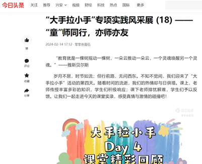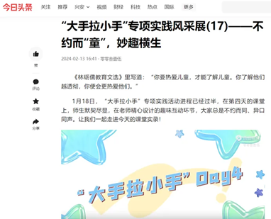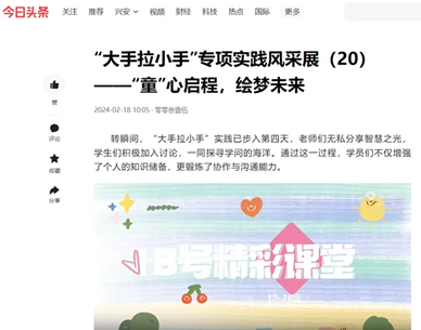为深入学习贯彻习近平新时代中国特色社会主义思想,全面贯彻落实党的二十大精神,引导和帮助广大青年学生上好与现实相结合的“大思政课”,在社会课堂中“受教育、长才干、作贡献”,增强广大青年学生在社会实践中的责任感和使命感。必一运动校团委组织开展2024年寒假“返家乡”社会实践活动,其中“大手拉小手”专项实践活动由必一·运动(b-sports)团委负责承办。2月12日、2月13日、2月14日、2月17日、2月18日,今日头条平台跟踪、报道专项实践活动。